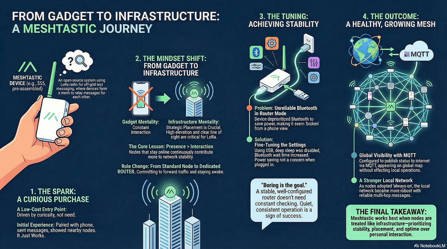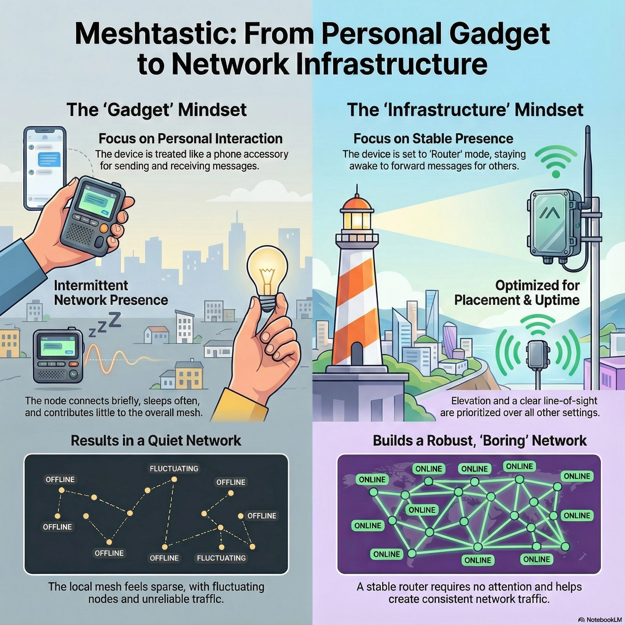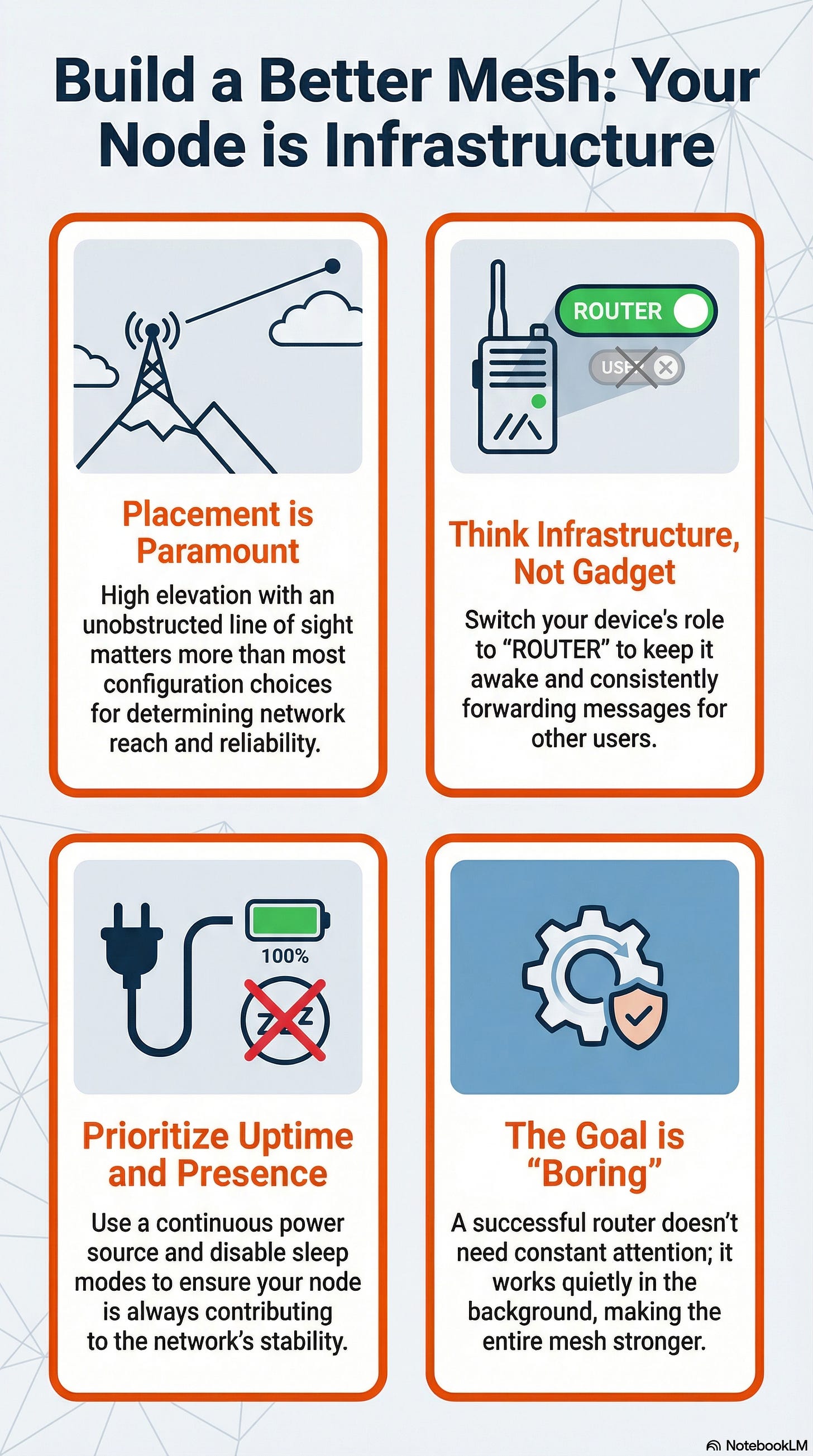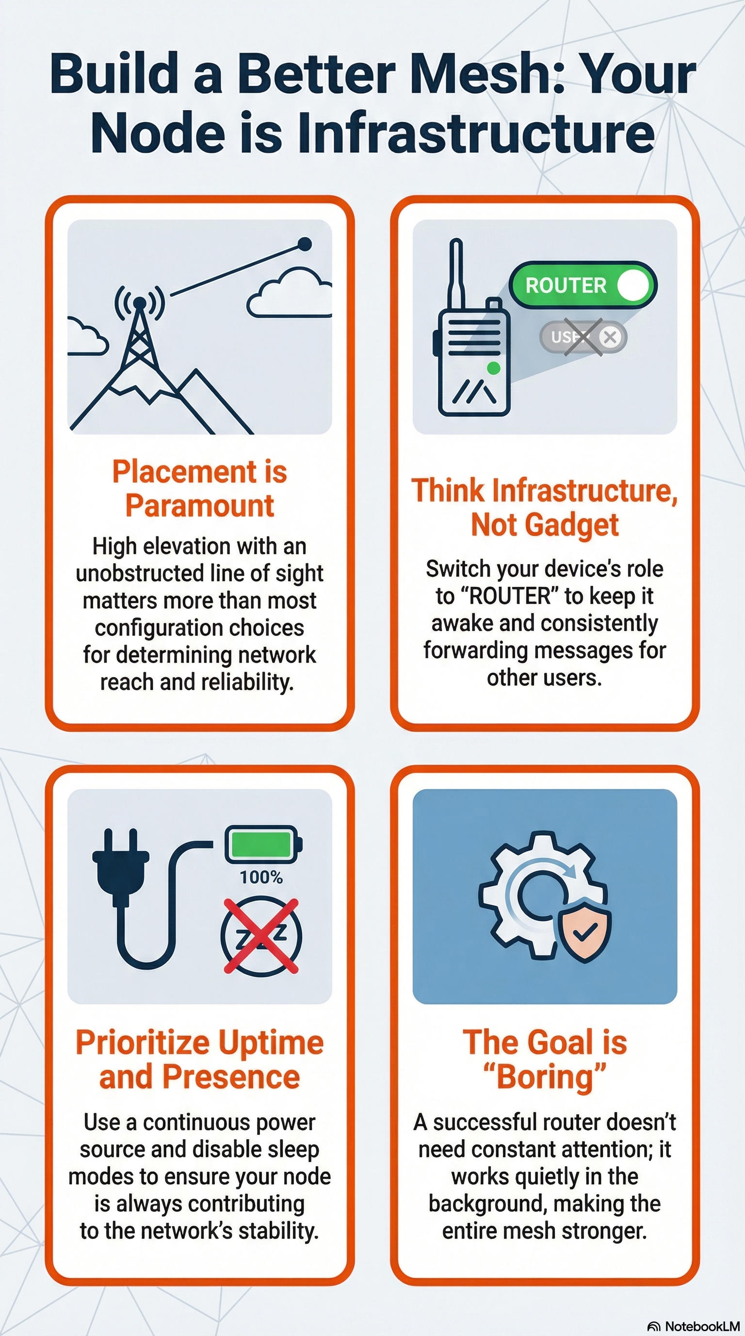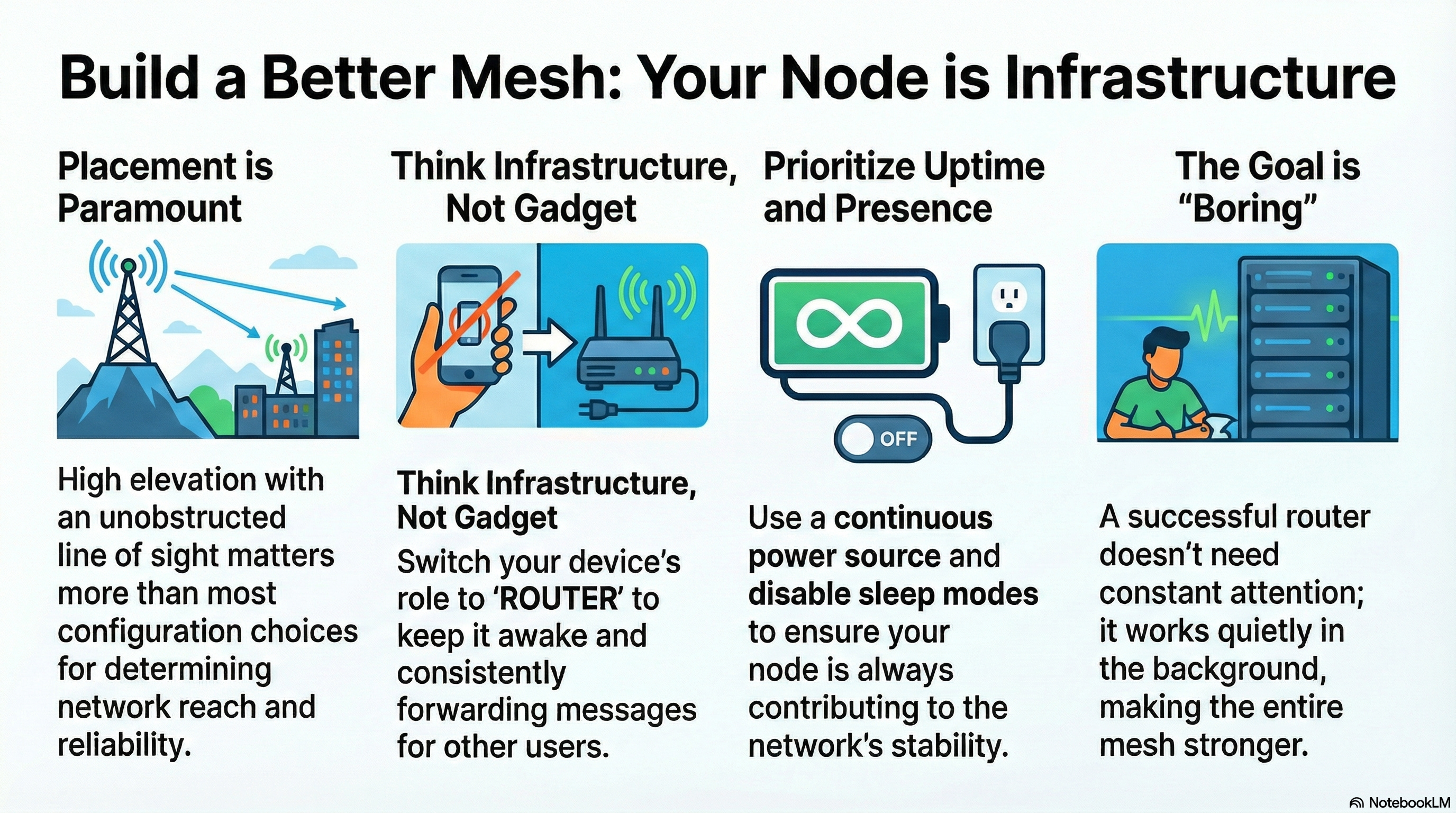 Meshtastic works best when you stop treating nodes like personal devices and start treating them like infrastructure. Infrastructure doesn’t need constant checking. It needs stability, placement, and uptime.