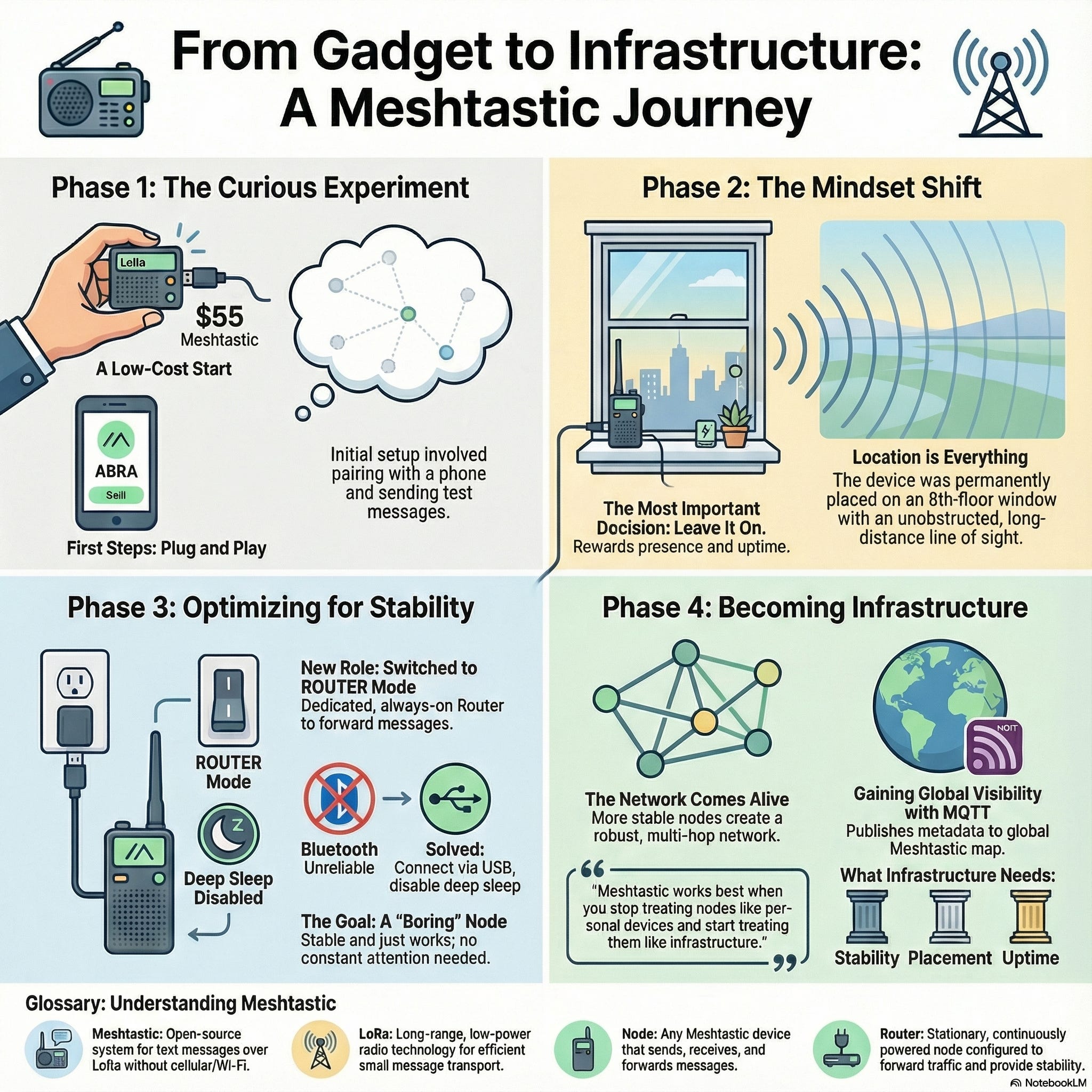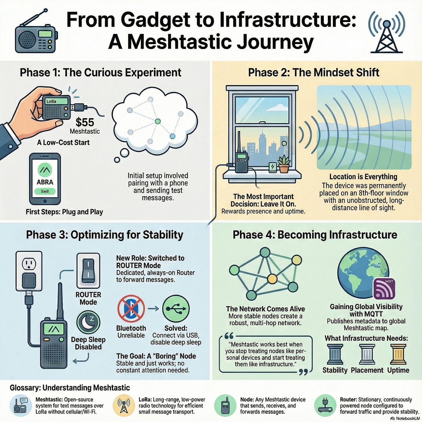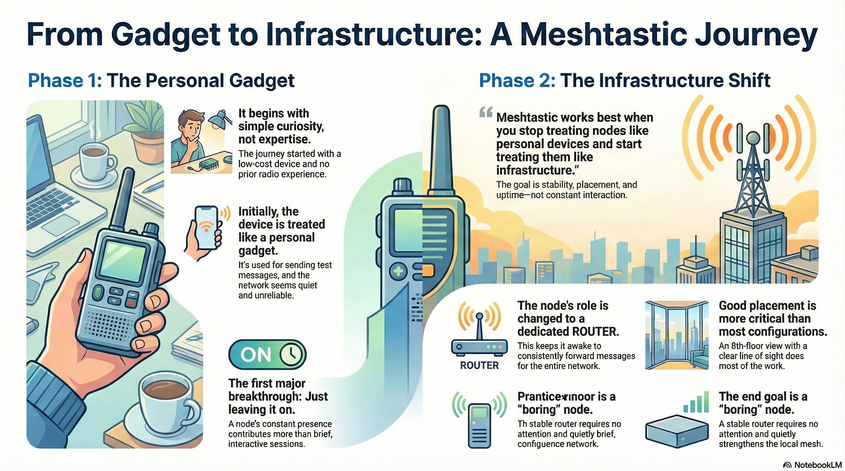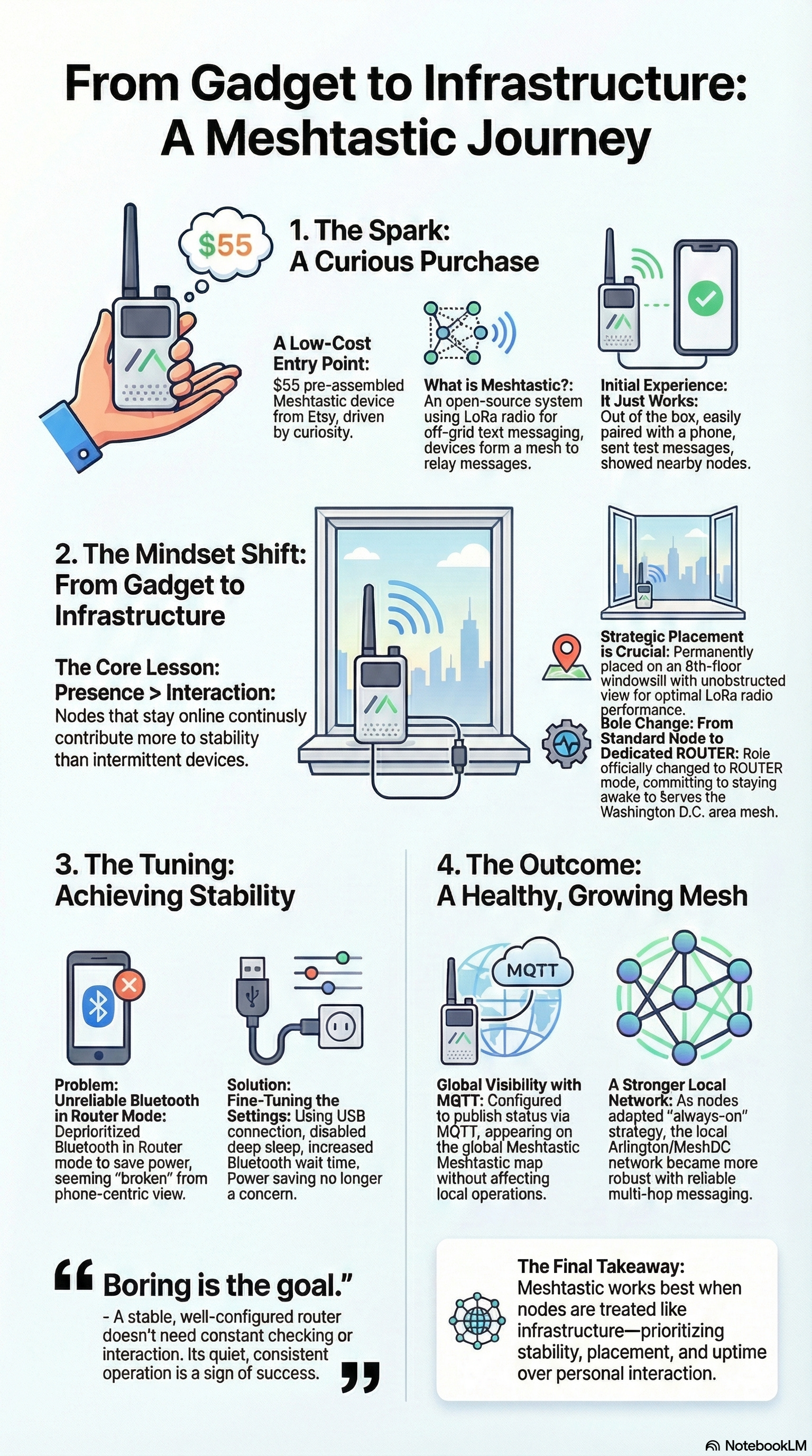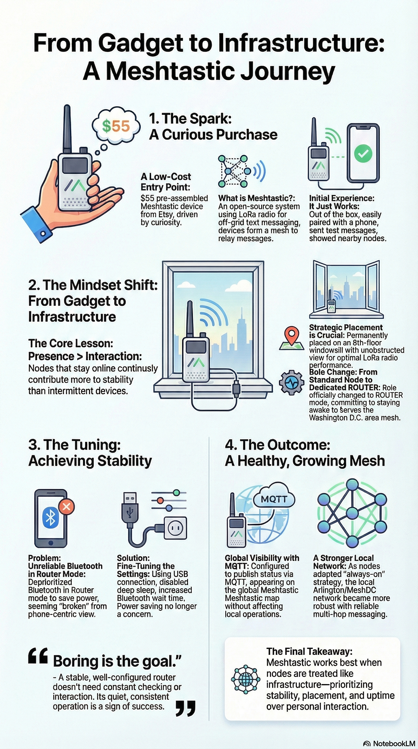 This text recounts Chris Abraham’s personal transition from a casual hobbyist to a provider of community radio infrastructure using Meshtastic technology. By placing a low-power LoRa device in an elevated apartment window, he established a consistent connection point for a decentralized messaging network in the Arlington area. The narrative explains how he optimized his hardware by switching it to router mode, prioritizing constant uptime and signal relaying over personal portability. He emphasizes that the network’s strength relies on permanent nodes that function independently of human interaction to facilitate reliable data hopping. Ultimately, the source serves as both a technical guide and a philosophical reflection on how individual presence can strengthen resilient communication systems.